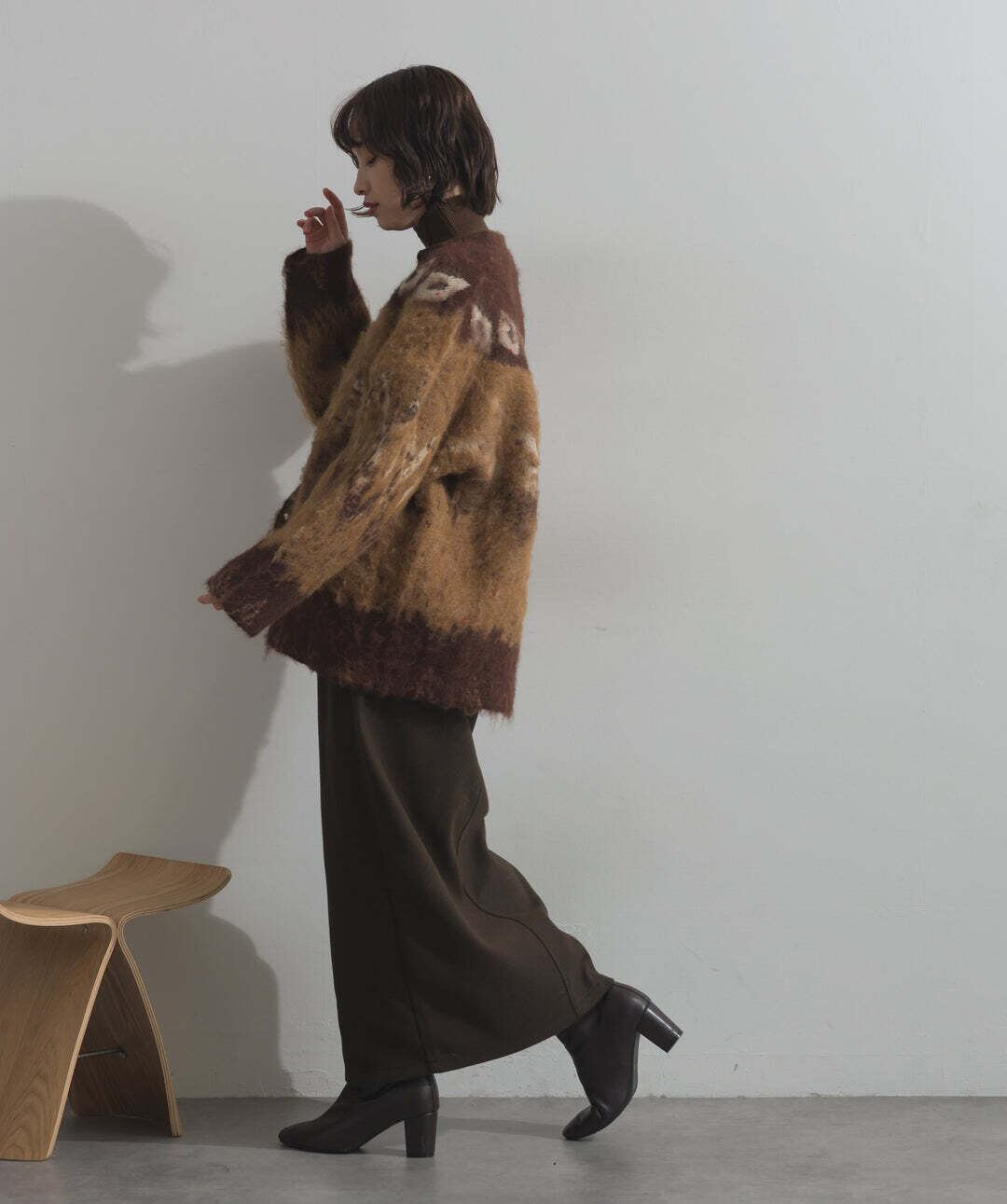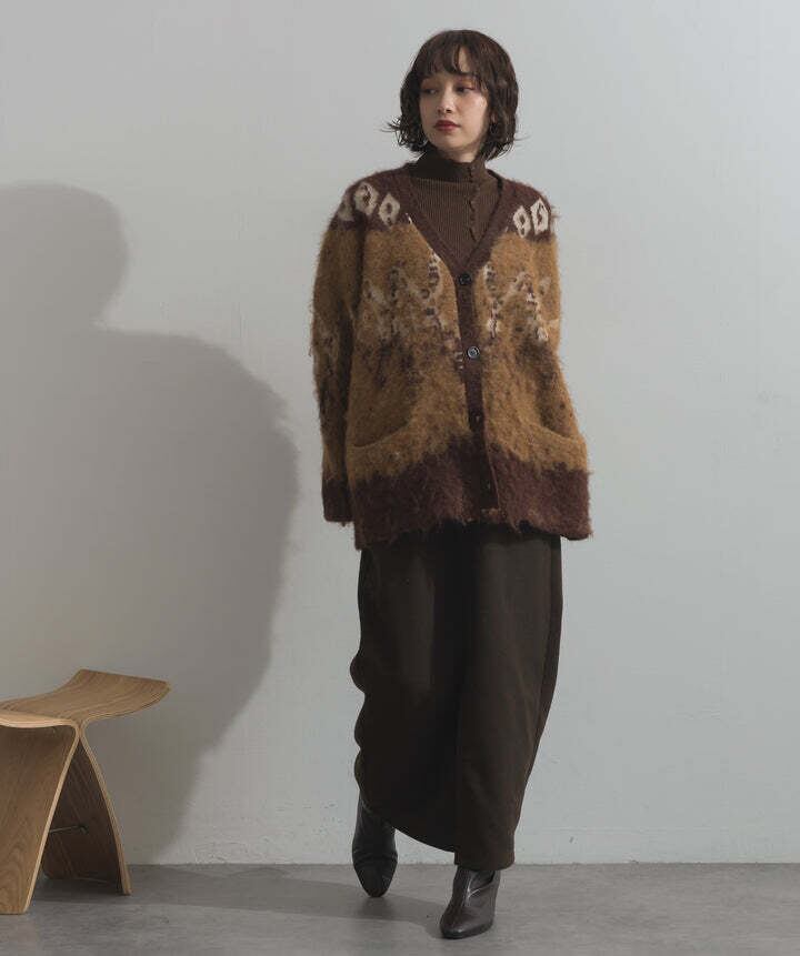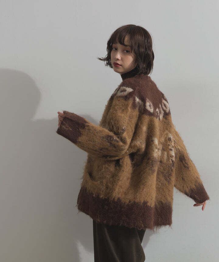 トレンドのシャギーニットにノルディック柄を大胆に落とし込んだ、主役級カーディガン。羽織るだけでシーズンムードを一気に引き上げてくれます。