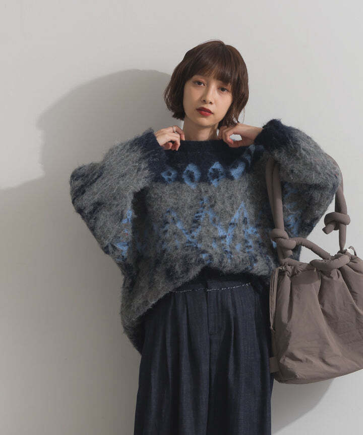 大胆なノルディックパターンが目を引く主役級プルオーバー。ドロップショルダーとオーバーサイズのシルエットが抜け感を演出し、スタイリングに旬なバランスを加えます。裾のランダムカットや毛足のある素材感が、ヴィンテージライクな雰囲気をプラス。デニムやロングスカートと合わせるだけで、即こなれ感のある着こなしに。
