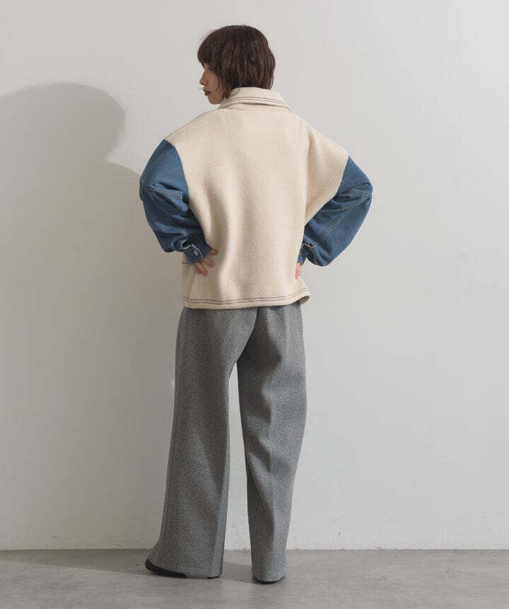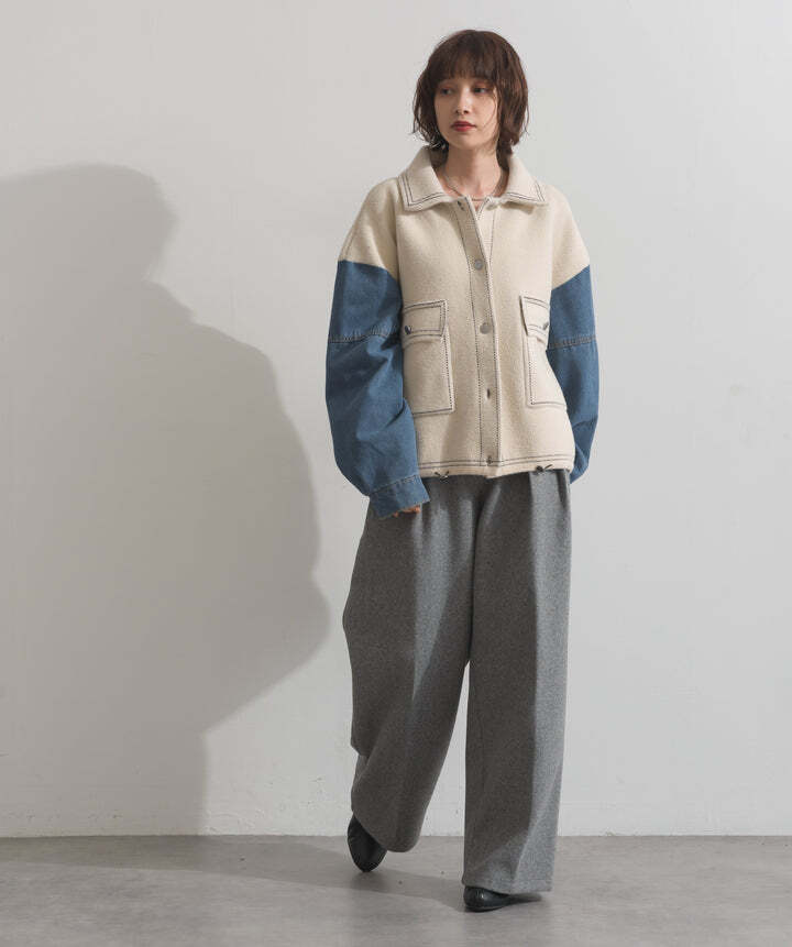 厚手でハリ感のあるしっかりとしたニット素材をベースに。配色のデニム切り替えを袖に施し、タフさとラフさを兼ね備えたモダンな印象に仕上げました。