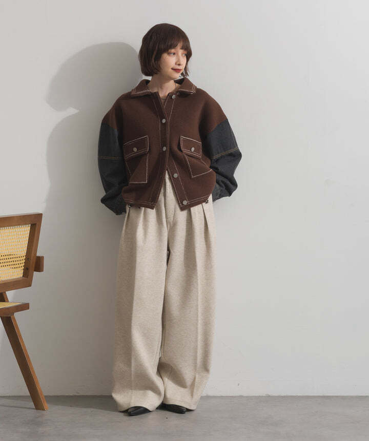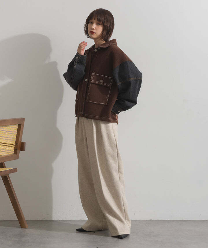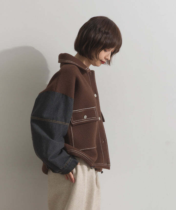 厚手でハリ感のあるしっかりとしたニット素材をベースに。配色のデニム切り替えを袖に施し、タフさとラフさを兼ね備えたモダンな印象に仕上げました。