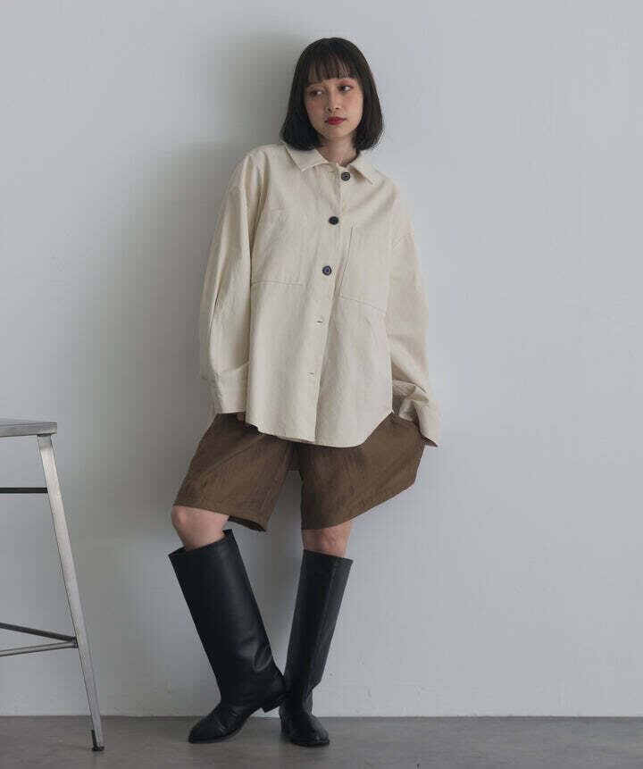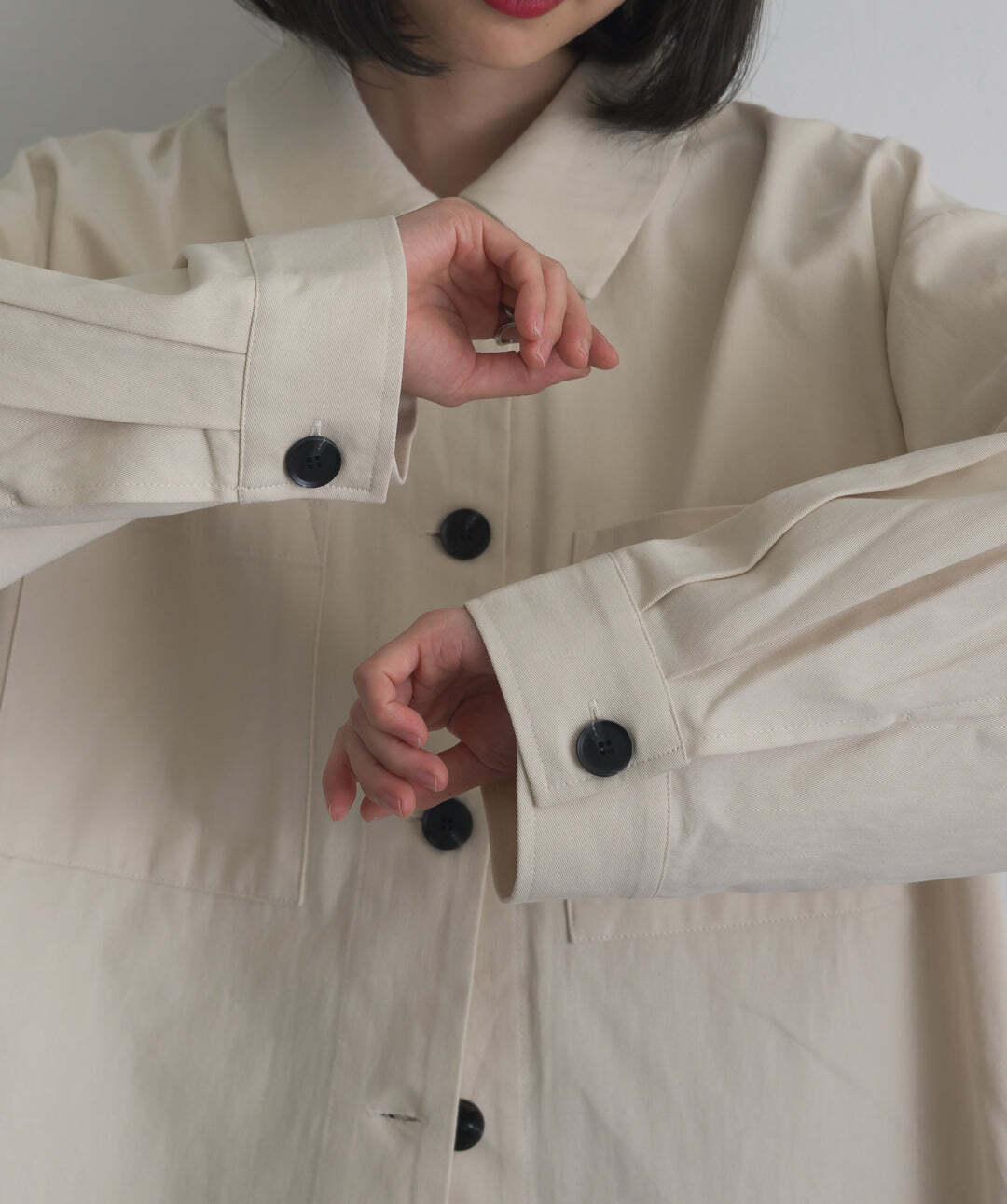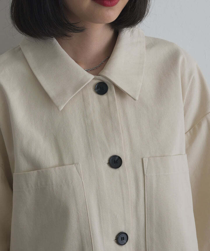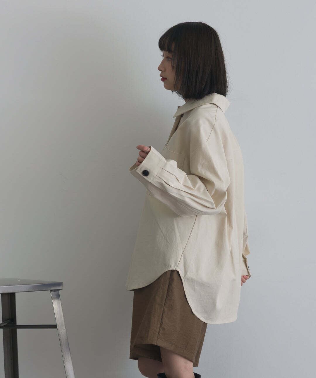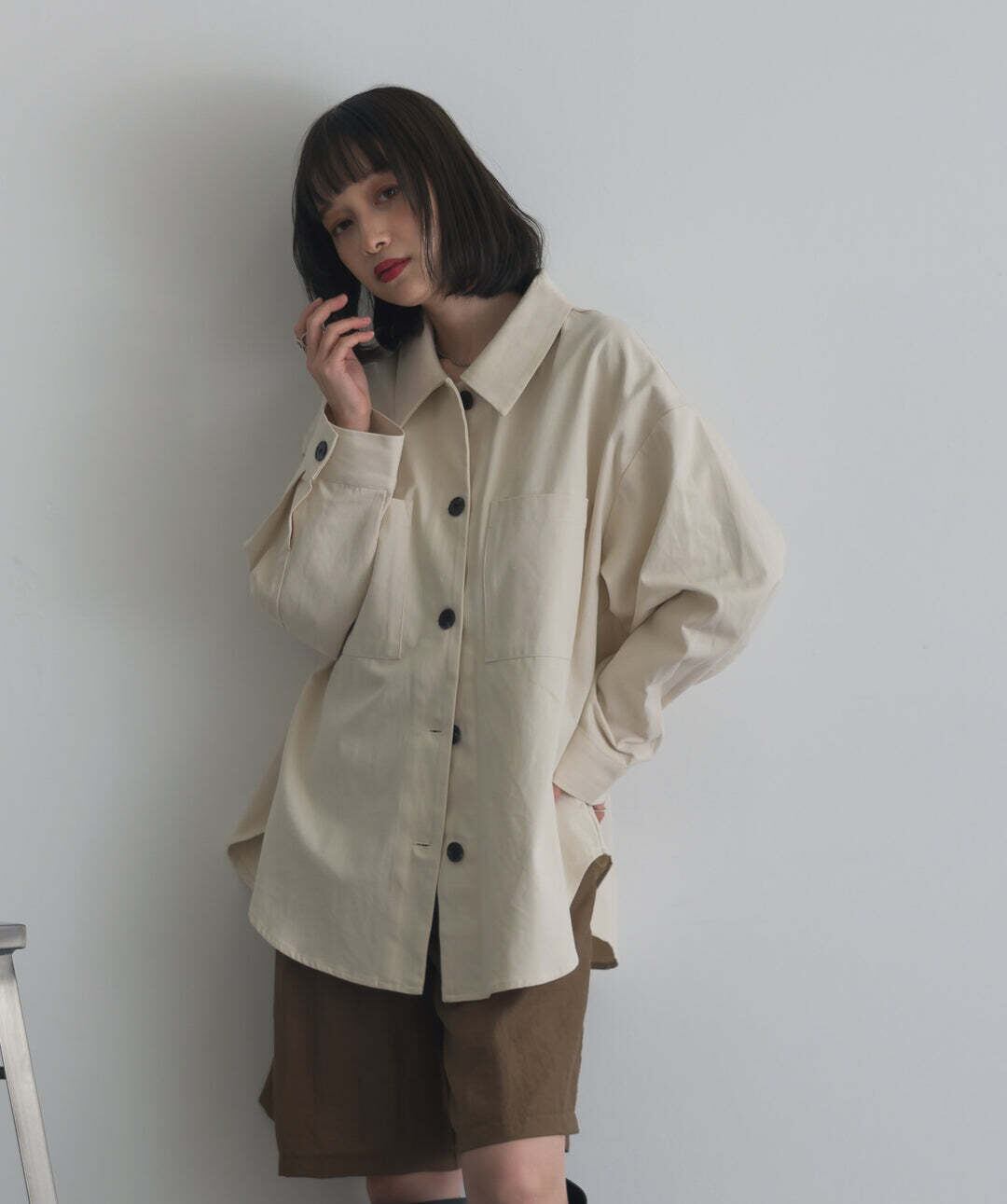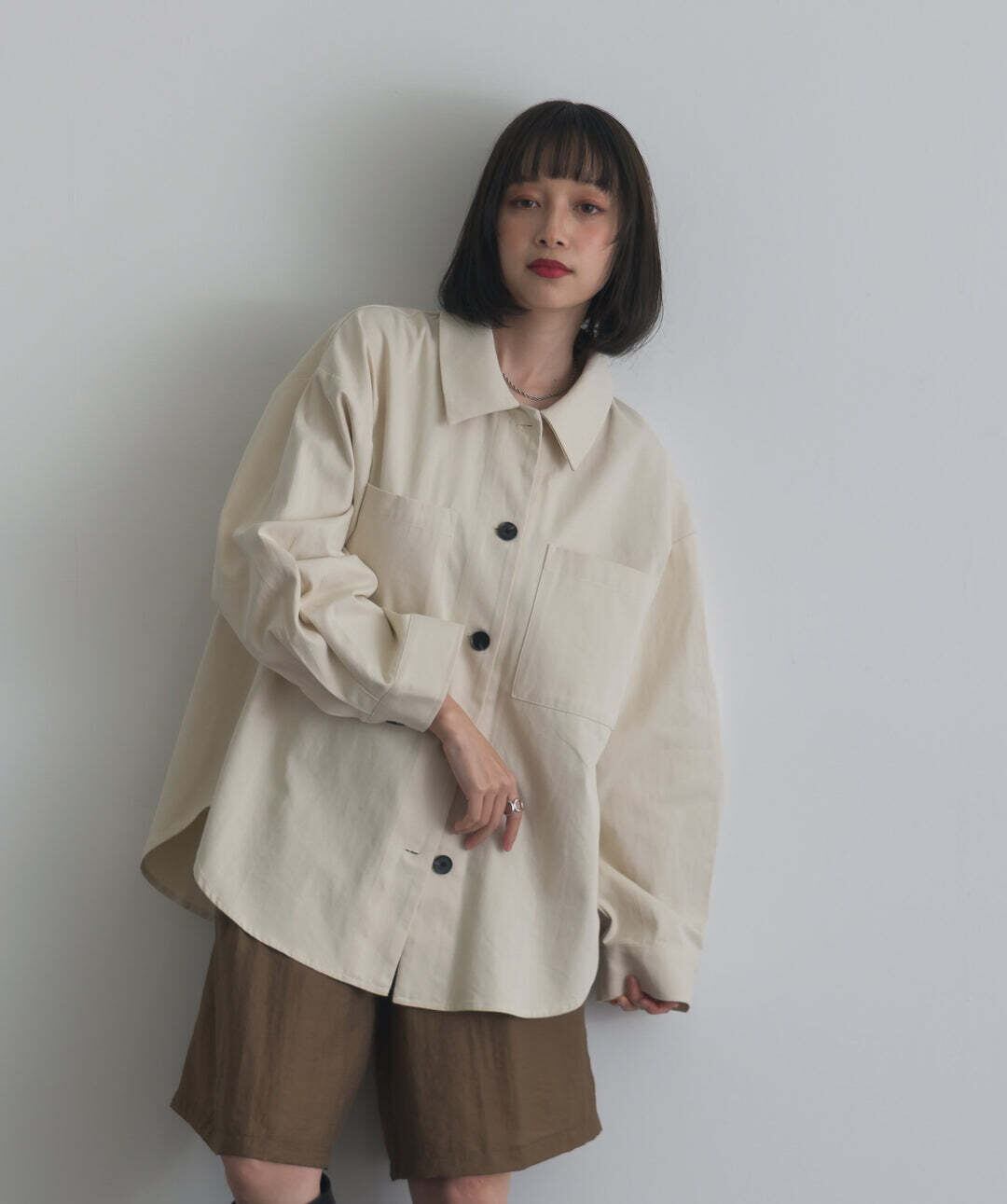 シャツの軽さとジャケットの存在感を融合させたシャツジャケットデザイン。大きめのフロントポケットと配色ボタンがアクセントになり、シンプルながらも洗練された印象に。ゆとりのあるオーバーシルエットとサイドスリットが抜け感を演出し、ワンピースやワイドパンツ、ショートボトムとも好相性。羽織としてもトップスとしても着回せる万能アイテムで、きれいめカジュアルからモードスタイルまで幅広く対応する一枚です。