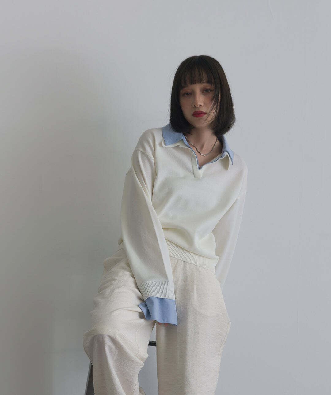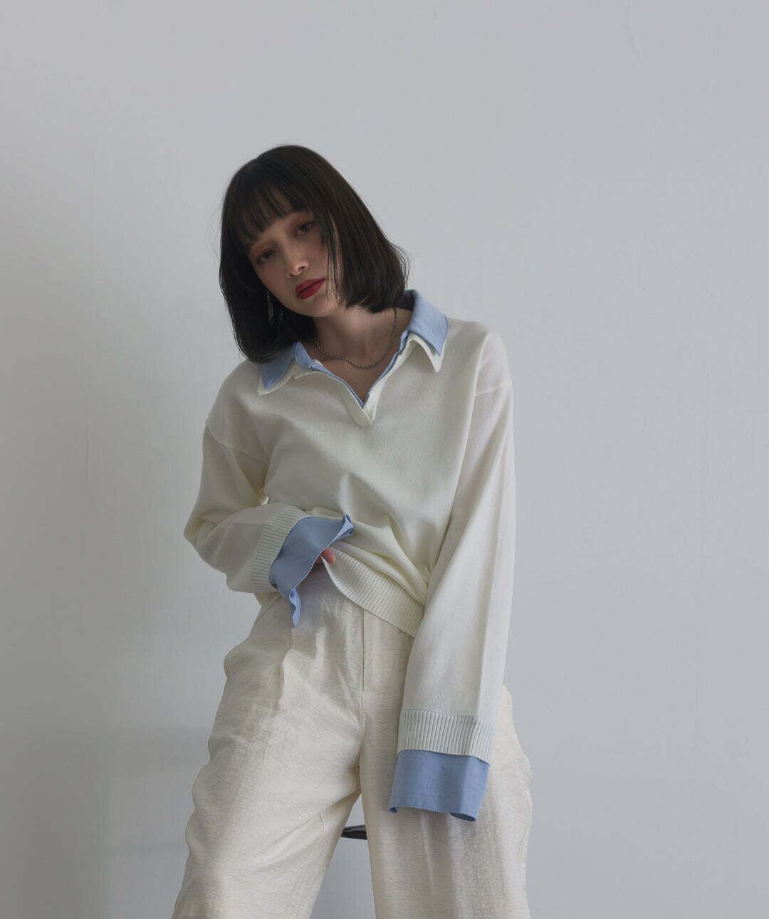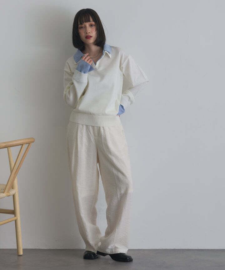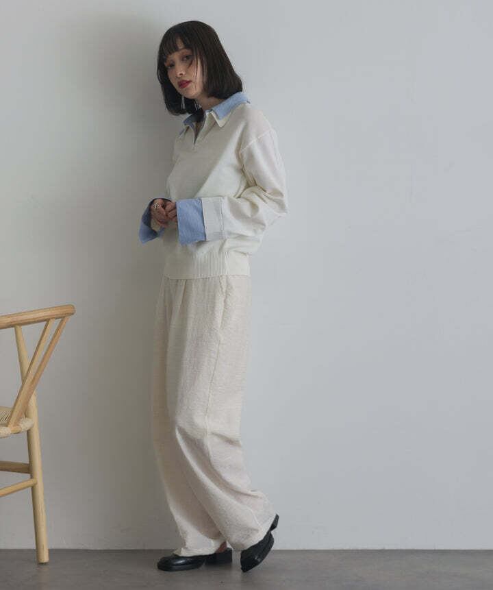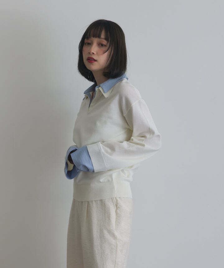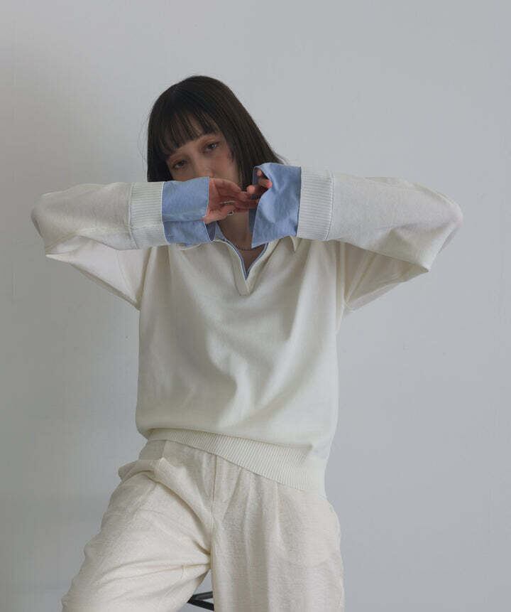 身頃は滑らかなニット素材を使用し、柔らかくストレスフリーな着心地。襟・カフス部分にはハリ感のある布帛素材をドッキングし、コントラストのある質感がスタイリングに奥行きをプラス。1枚で着映えする異素材コンビデザインです。