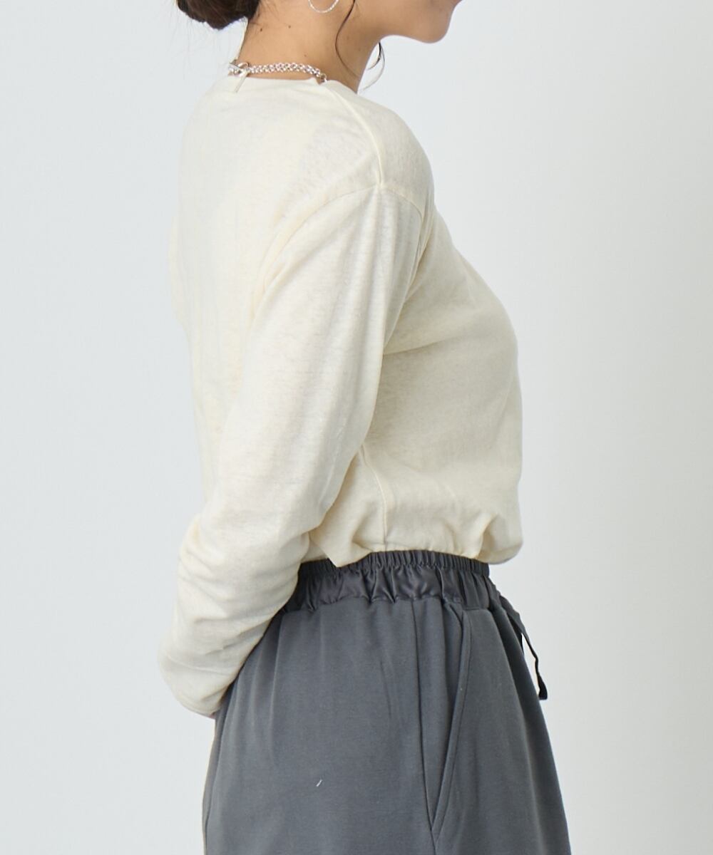 綿麻のベーシックなTシャツの袖口からチュールを覗かせたヘビロテ間違いなしのアイテムです。長めの着丈はラウンドヘムになっており、レイヤードコーデにも重宝する1枚です。
