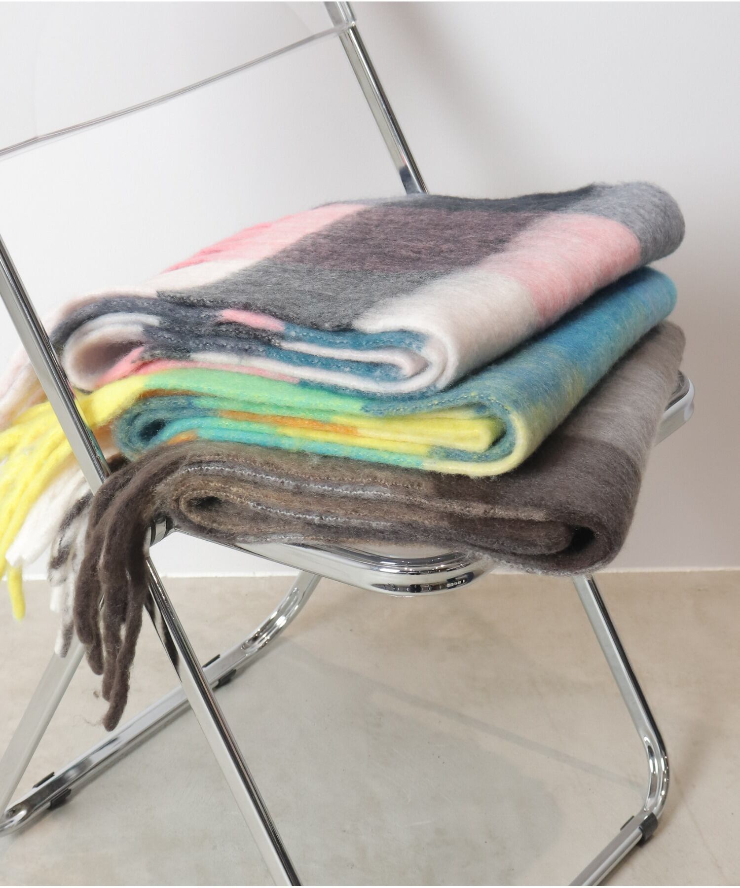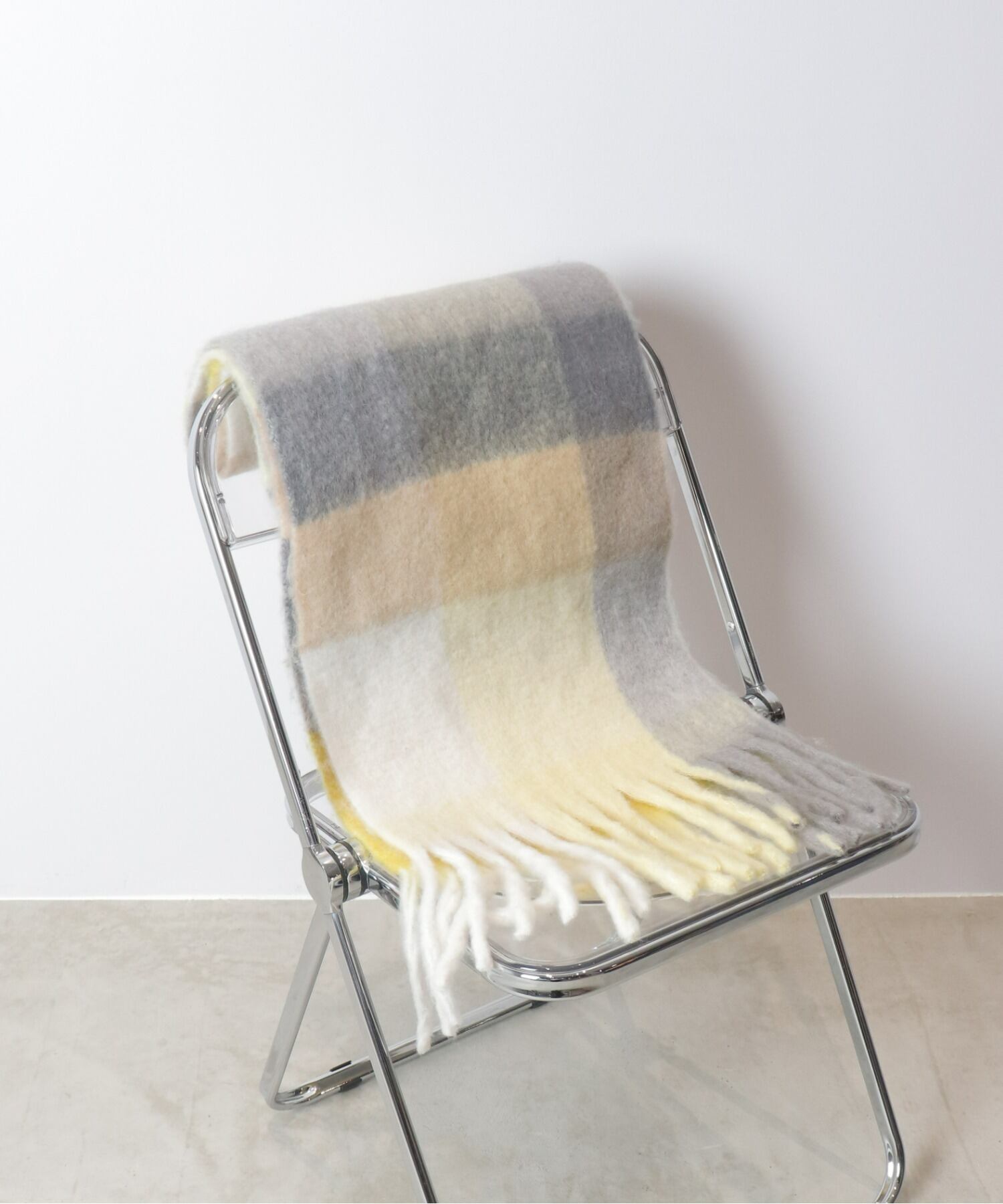 マルチカラーのチェックがシーズン感を高めるボリュームストールは、やわらかで肌当たりの優しいフラッフィーな素材が使用されています。太めのフリンジデザインとの掛け合わせで存在感があり、スタイリングのアクセントにもピッタリです。無造作に巻いたり、肩掛けしたり、ブランケット代わりにもなる便利な1枚です。