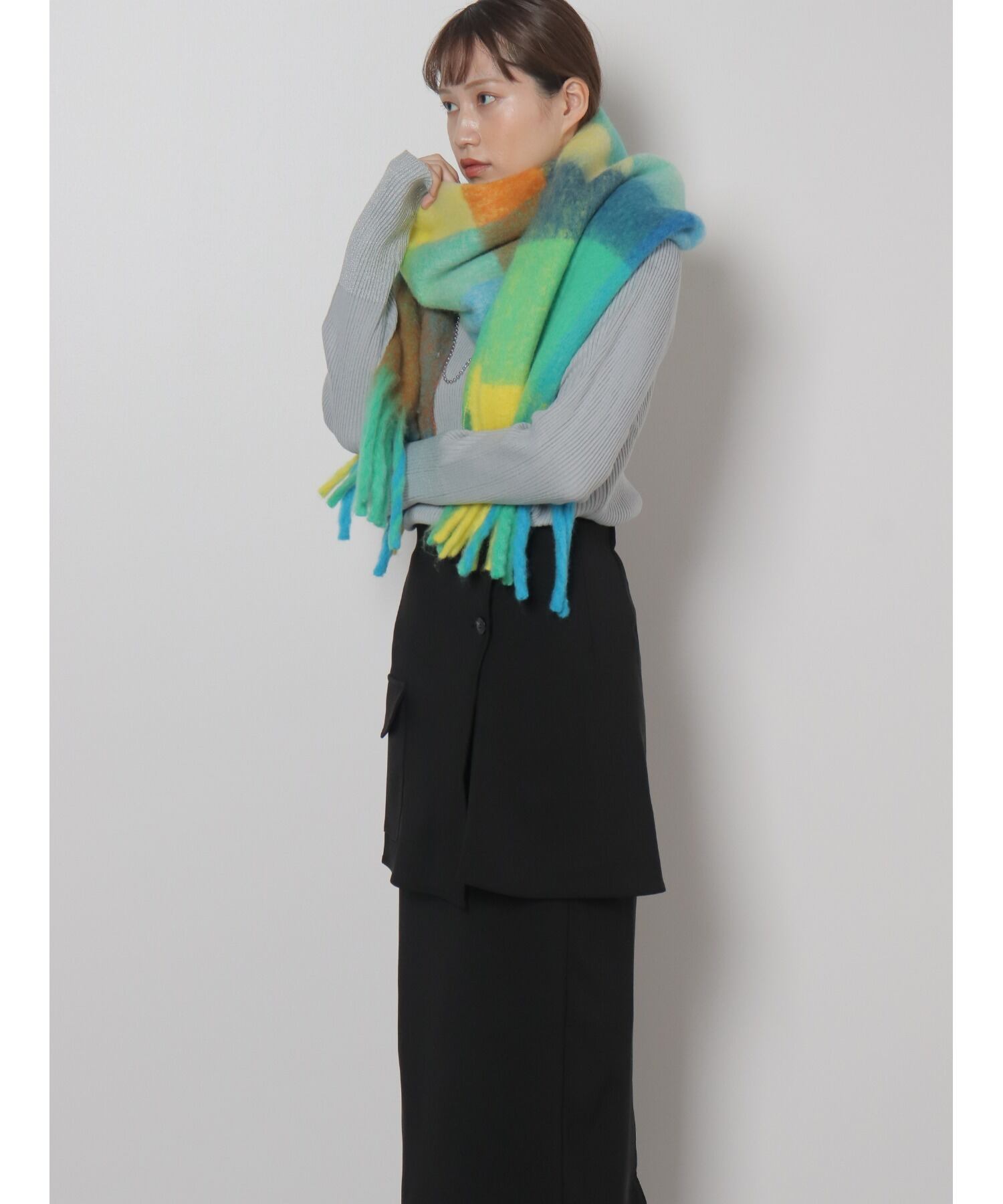 OI210503 マルチカラーチェック柄フラッフィーストール blue