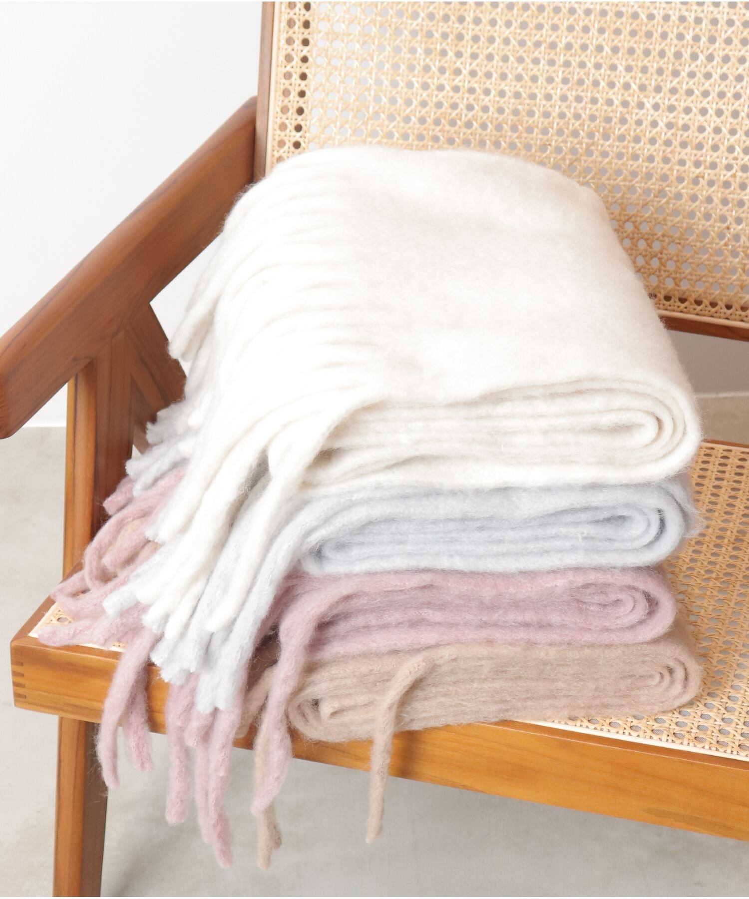 柔らかで肌触りのよいフラッフィーな素材を使用したストールは、単色でシンプルに仕上げつつも太めのフリンジデザインがアクセントになっています。大判サイズなので無造作に巻くだけでもさまになり、屋内ではブランケット代わりにもなる便利なアイテムです。