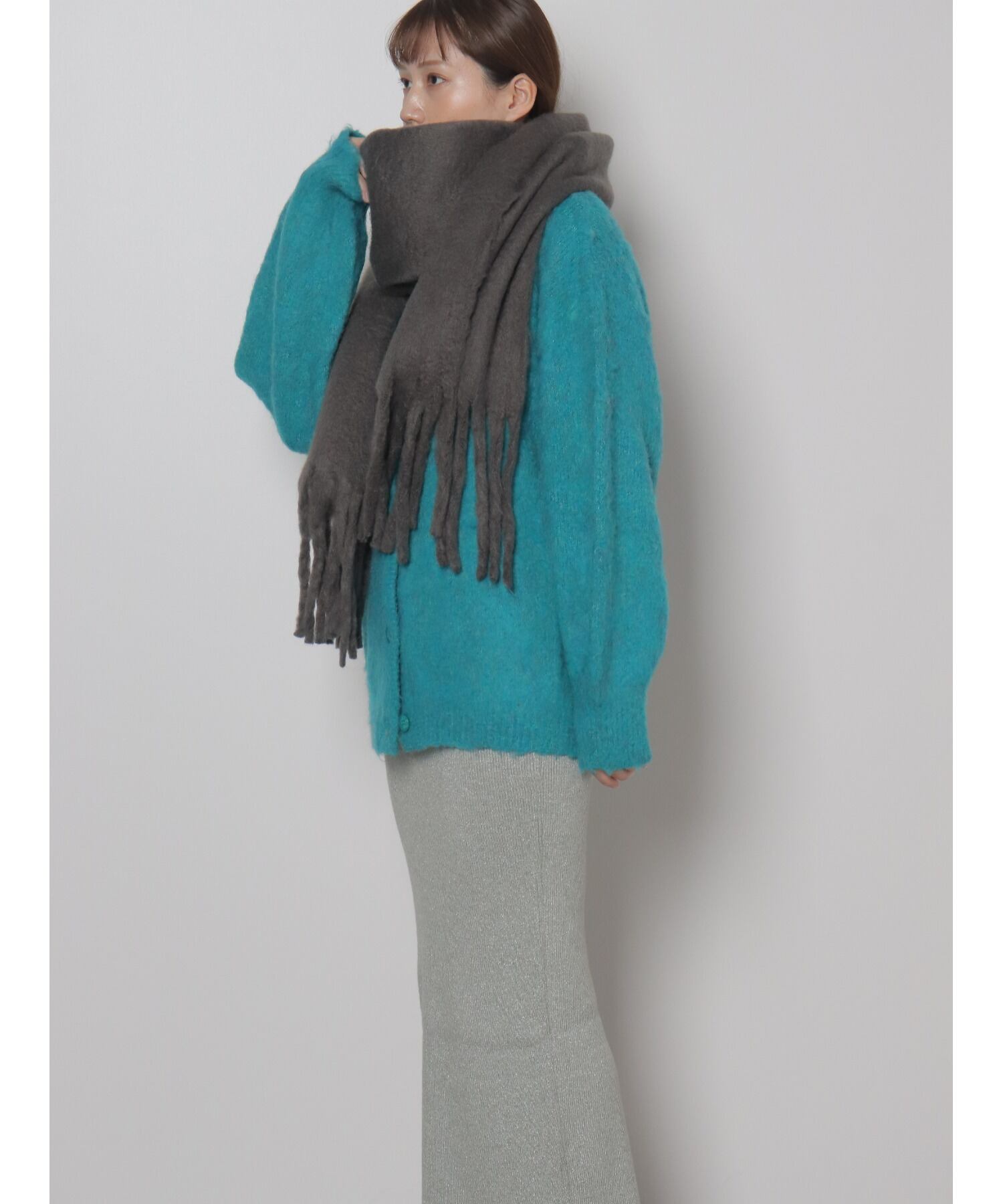 柔らかで肌触りのよいフラッフィーな素材を使用したストールは、単色でシンプルに仕上げつつも太めのフリンジデザインがアクセントになっています。大判サイズなので無造作に巻くだけでもさまになり、屋内ではブランケット代わりにもなる便利なアイテムです。