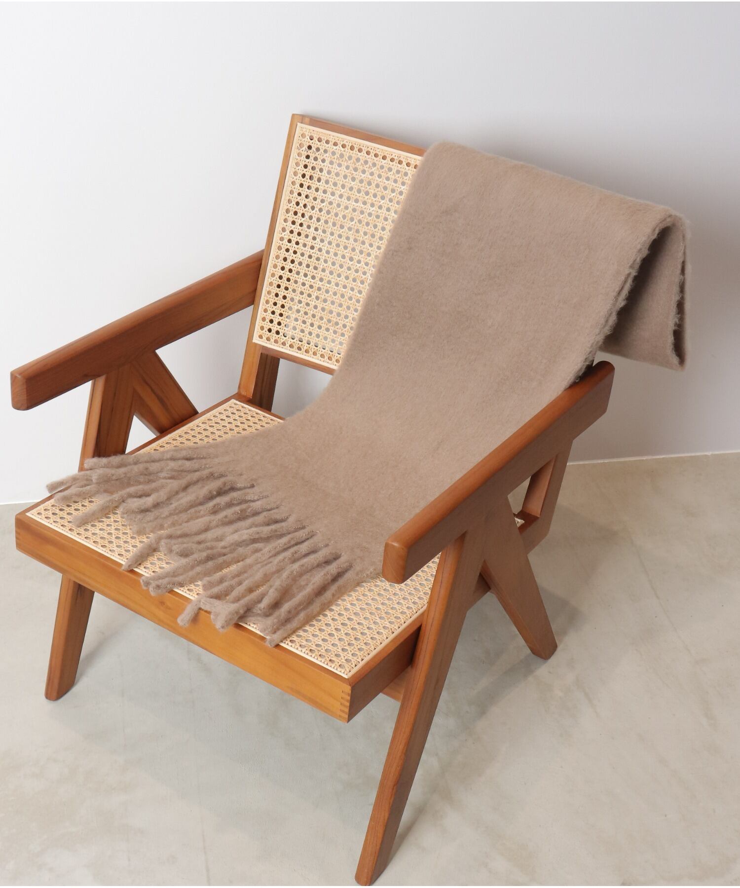柔らかで肌触りのよいフラッフィーな素材を使用したストールは、単色でシンプルに仕上げつつも太めのフリンジデザインがアクセントになっています。大判サイズなので無造作に巻くだけでもさまになり、屋内ではブランケット代わりにもなる便利なアイテムです。